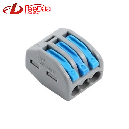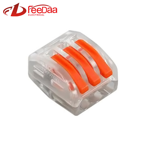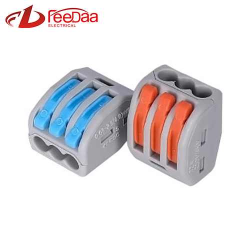 FeeDaa® specializes in producing the 222 series quickly wire connector | 1 in 2 out PCT-213, the connector shell is made of flame-retardant nylon PA66/PC new material, and the inner guide is made of all copper. It can be used for both soft and hard wires, with 1 in and 1 out, and the wiring range is 0.08-2.5mm² (Single hard conductor), 0.08-4.0mm² (Multi-strand flexible conductor), safer, more convenient, and faster than traditional wiring methods in the past.Please rest assured to choose us, and we will provide the best service!