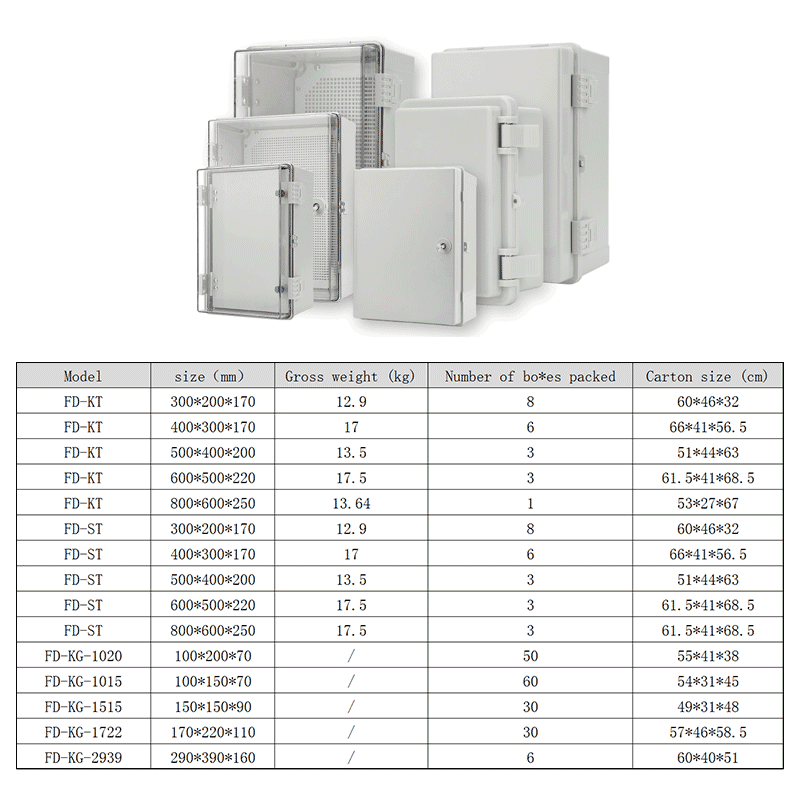 grayKey attributes IP levelip66TypeJunction BoxPlace of OriginZhejiang, ChinaBrand NameFeeDaaExternal SizecustomizedMaterialABSMOQ1pcColortransparentProduct NameElectrical Junction BoxesFunctionWaterproof DustproofApplicationOutdoor Electronic EquipmentSizeinstrument enclosuresCertificateROHS CEUsageEqu......