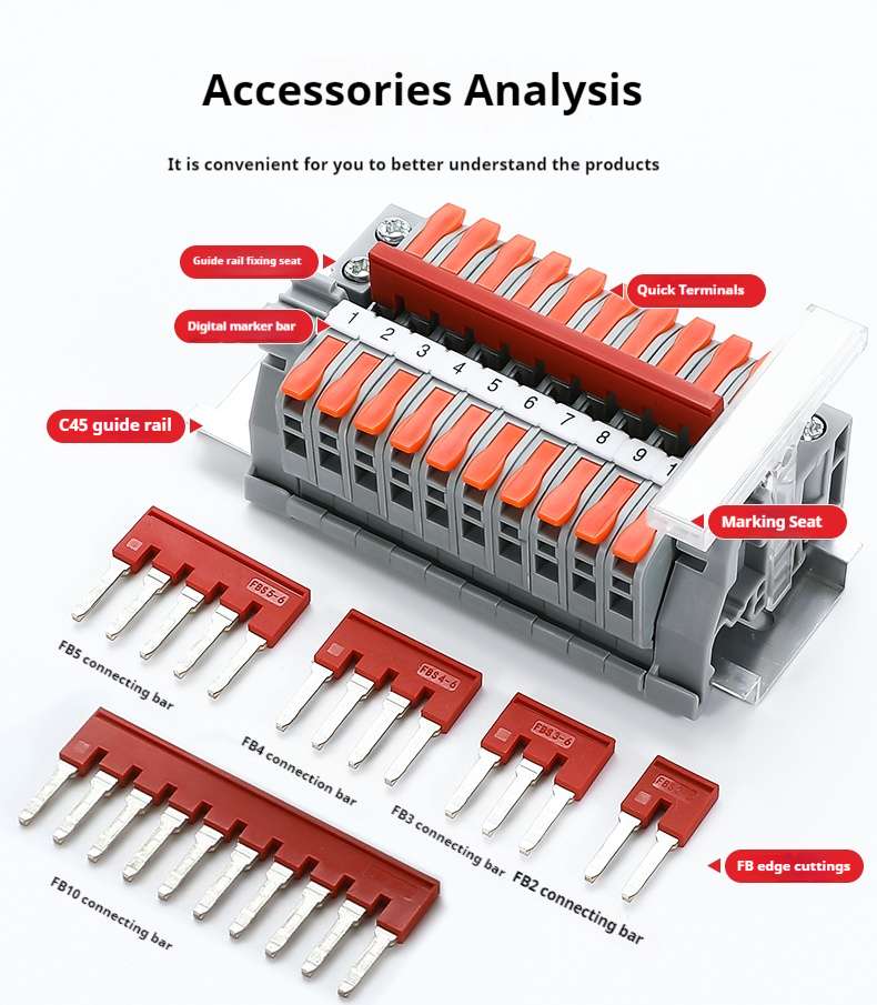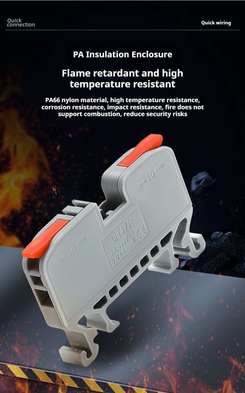 FeeDaa® specializes in producing the Fast Wire Cable Connectors| 1 in 1 out UTJ7R, the connector shell is made of flame-retardant nylon PA66 new material, and the inner guide is made of all copper. It can be used for both soft and hard wires, with 1 in and 1 out, and the wiring range is 0.2-2.5mm²(Single hard conductor), 0.2-4.0mm²(Multi-strand flexible conductor), safer, more convenient, and faster than traditional wiring methods in the past.Compared to PCT-221, the difference is that the product has a "foot" at the bottom that can be directly installed on the guide rail.