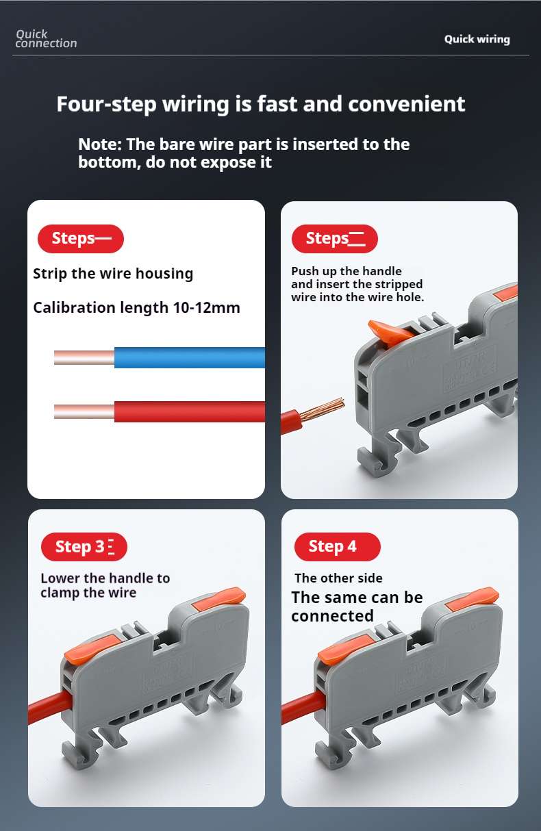 Efficient and convenient: Fast wiring, no tools required, no damage to the core wire. Simply peel off approximately 12mm of the wire casing, open the handle to 90 °, insert the wire into the connection port, and press the handle with your hand to complete the wiring. There is no need to worry about twisting between wires. The FeeDaa®connector will make work easier and wiring more aesthetically pleasing.