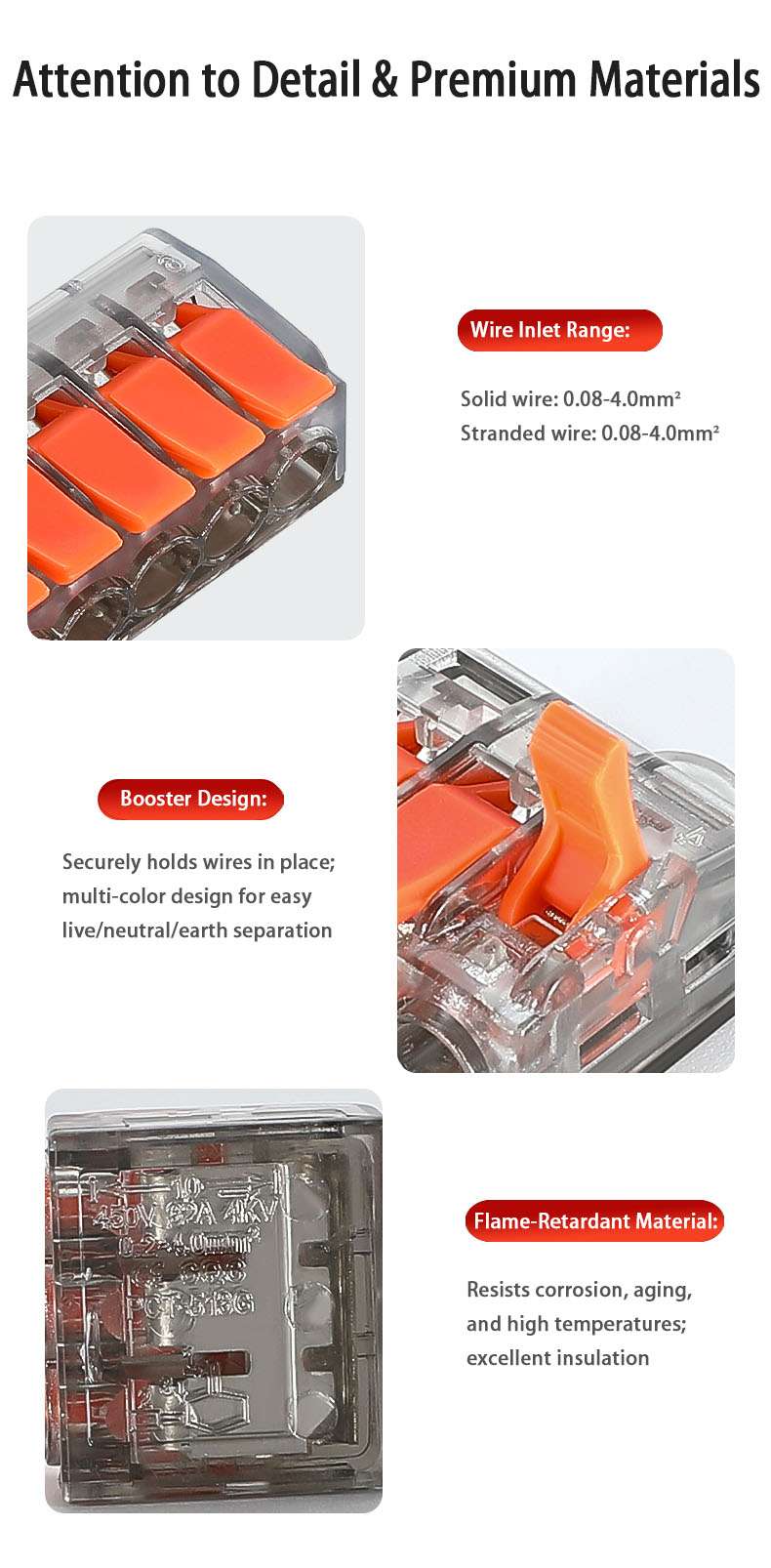 This is our newly produced 5 series terminal. The incoming wire range is as follows: hard wire :0.08-4.0mm ², flexible wire :0.08-4.0mm ². It is not prone to corrosion and aging. It has high heat resistance and strong insulation