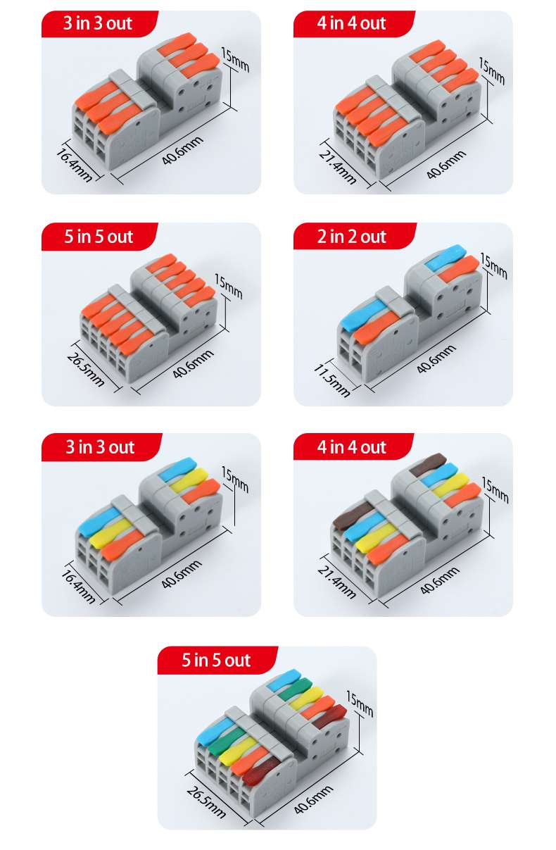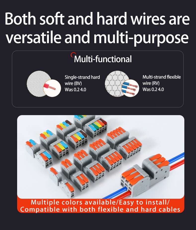 Compatibility: FeeDaa® ‘sWire Cable Connectors| 5 in 5 out UTJ7D-5P can be used for both soft and hard wires, making it ideal for compact and complex applications. Suitable for single strand hard wire 0.08-2.5mm²,Multi-strand flexible conductor 0.08-4.0mm².